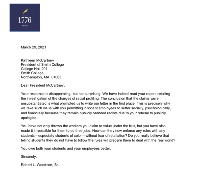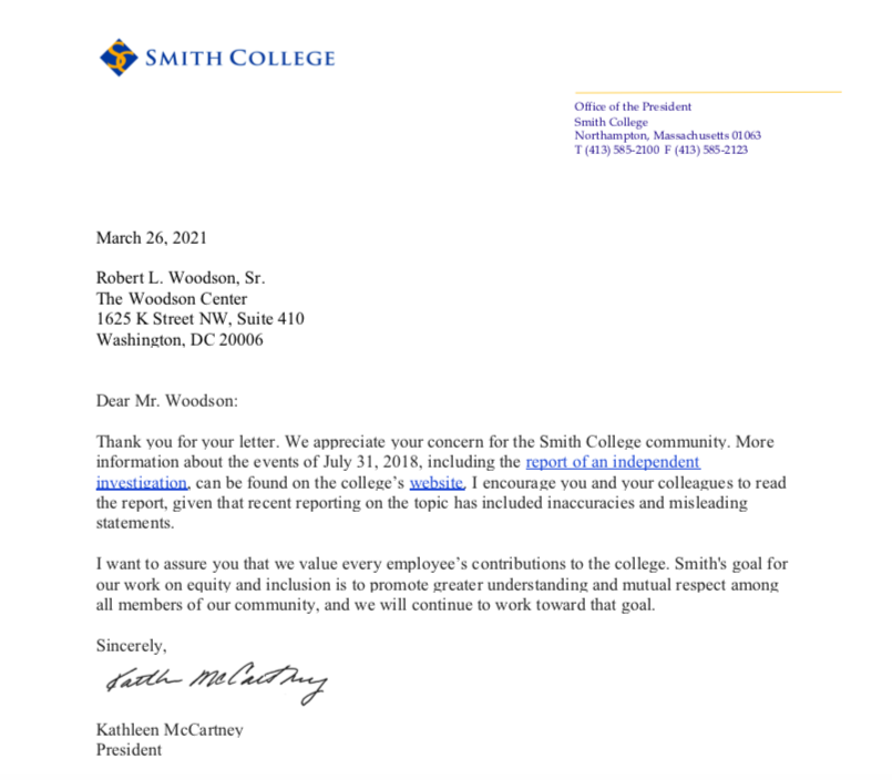On behalf of our signatories, Bob Woodson issued the following response to Smith College President Kathleen McCartney, writing that she owes both her students and her employees better than this: